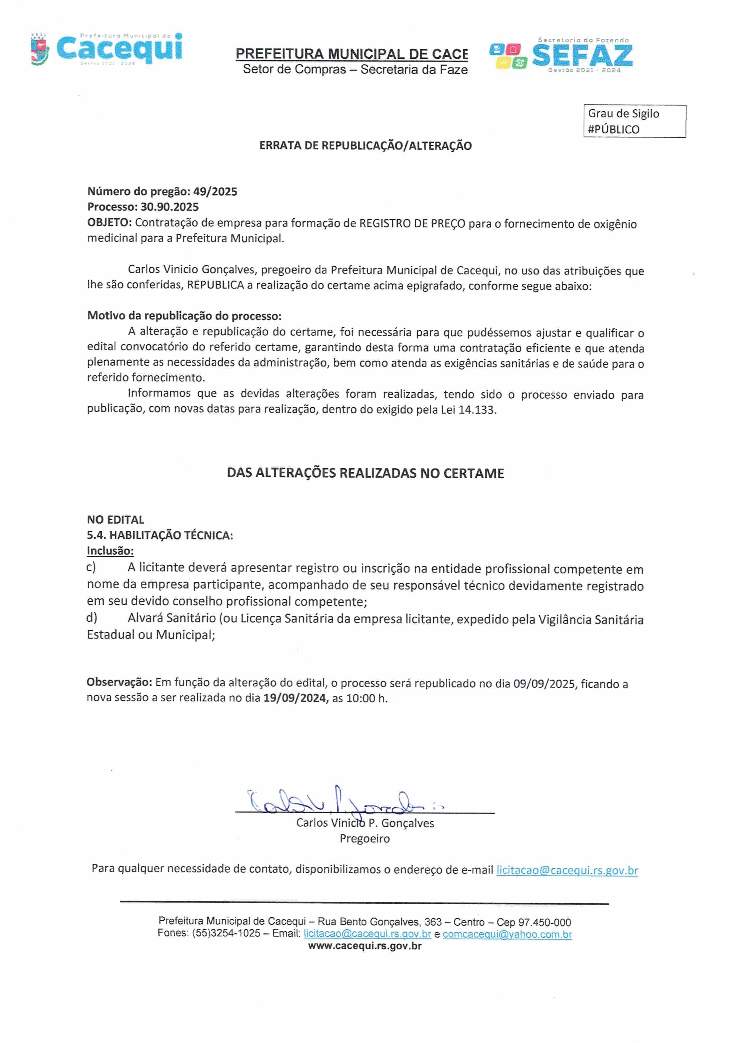 Contratação de empresa para a formação de REGISTRO DE PREÇO para o fornecimento de oxigênio medicinal para a Prefeitura Municipal de Cacequi. |