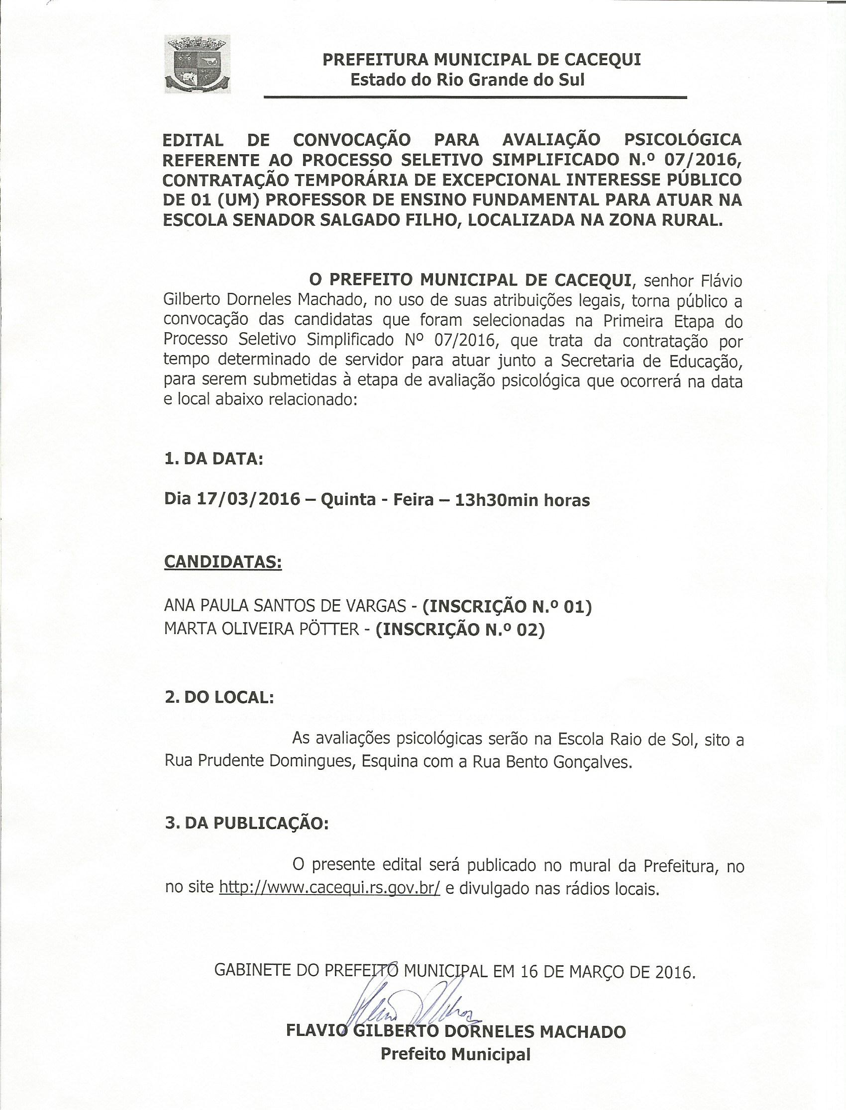 | Divulgação | Edital de Convocação para Avaliação Psicológica do Processo Seletivo 04/2016 | - | Ver |