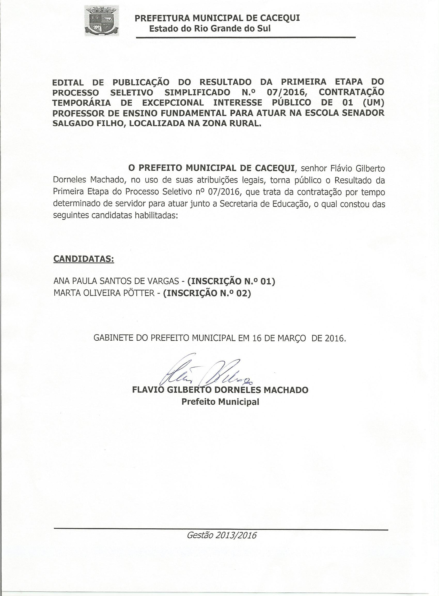 | Divulgação | Resultado Primeira Etapa Processo Seletivo 0/2016 | - | Ver |
