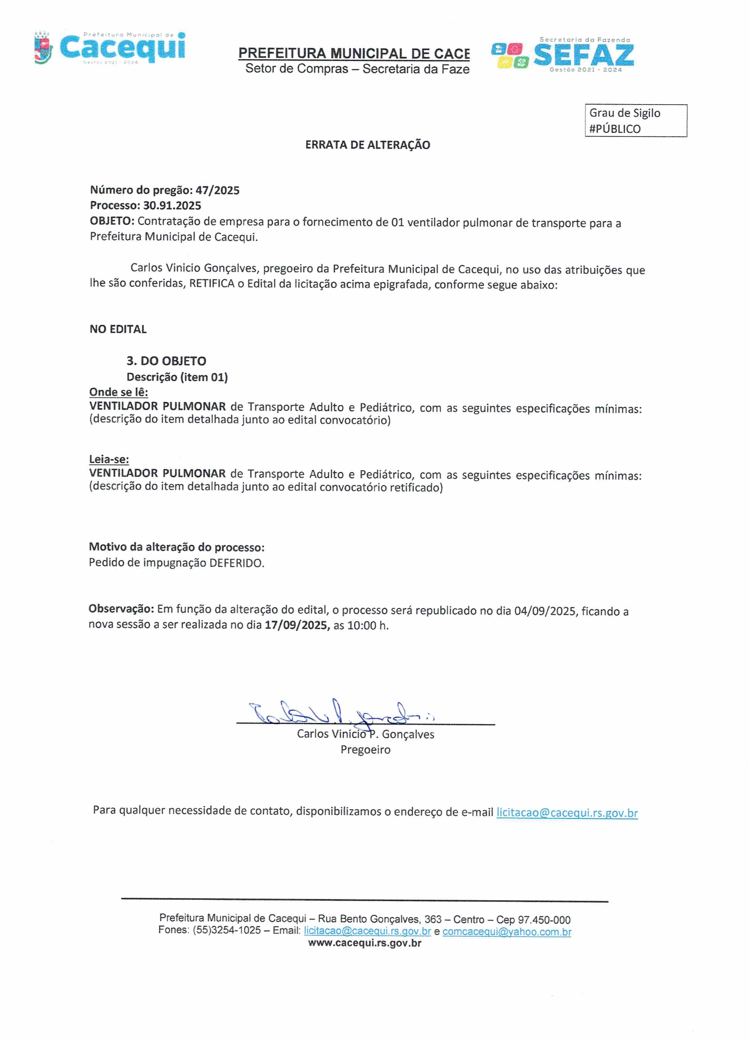 Contratação de empresa para o fornecimento de 01 ventilador pulmonar de transporte para a Prefeitura Municipal de Cacequi. |