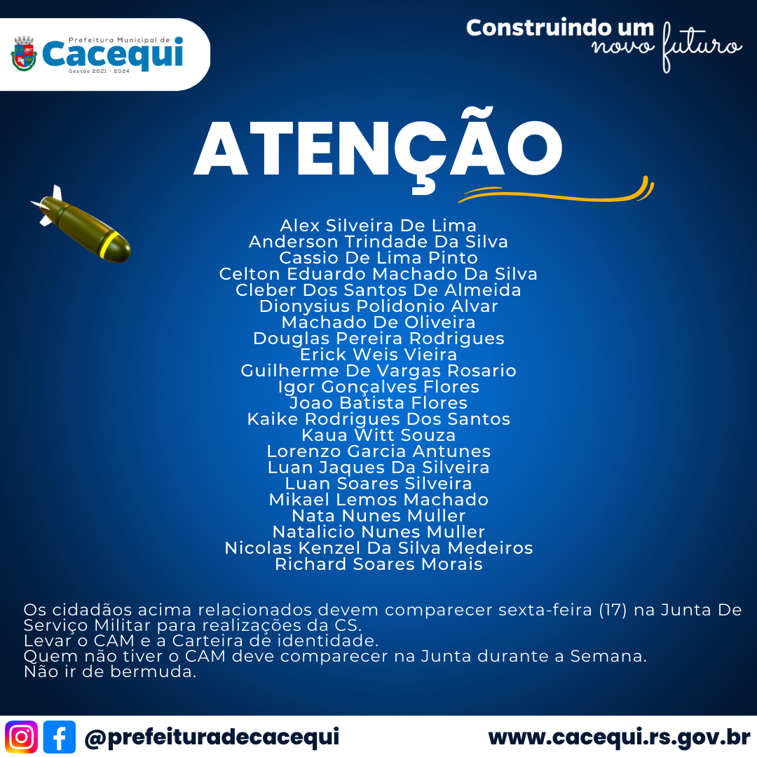 Os cidadões relacionados devem comparecer sexta-feira (17) na Junta De Serviço Militar para realizações da CS.